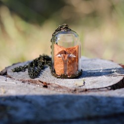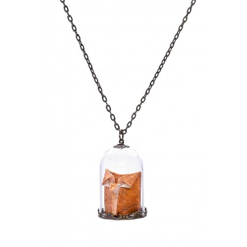Necklace with bronze chain and pendant with glass dome; inside, a miniature owl in origami, folded with Duo Thai paper, designed by me in January 2021.