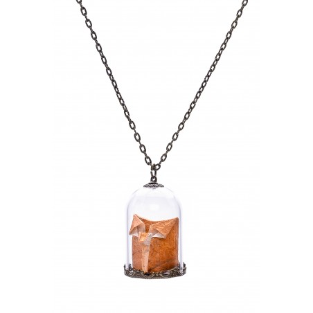 Necklace with bronze chain and glass dome with inside a miniature of owl made with origami paper