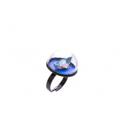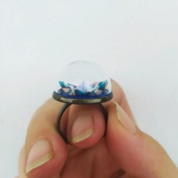 Adjustable ring with half a glass bowl. Inside, a miniature boat in origami paper that floats on a blue sea. The bronze used is hypoallergenic and nickel free.
