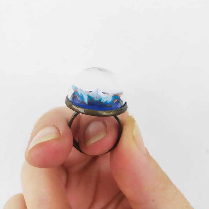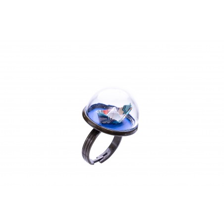 Adjustable ring with half a glass bowl. Inside, a miniature boat in origami paper that floats on a blue sea. The bronze used is hypoallergenic and nickel free.