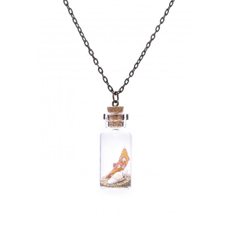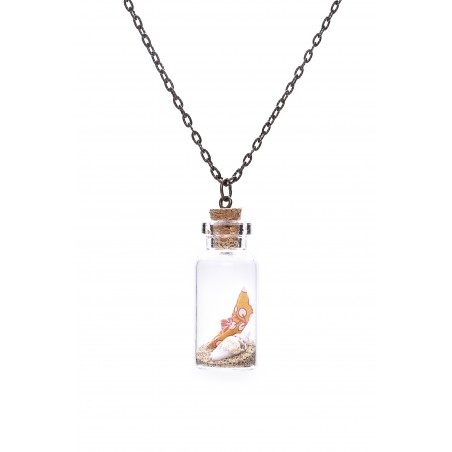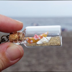 Ciondolo con bottiglietta in vetro e tappo in sughero con all'interno miniatura di barchetta in origami con sabbia di Sicilia e conchiglietta vera.