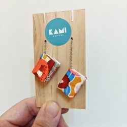 Pezzi unici creati con carta giapponese Yuzen Chiyogami e piegati con all'interno carta di libri destinati al macero. Sugli orecchini viene passata una vernice trasparente che li rende impermeabili e ne esalta la brillantezza.