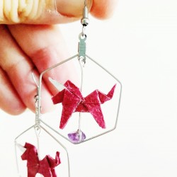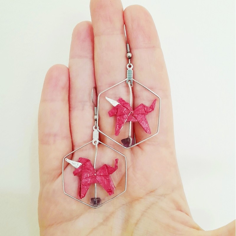 Orecchini leggerissimi in cornice esagonale, con all'interno un unicorno rosa realizzato con carta Washi deluxe patrimonio Unesco e perline di ametista.