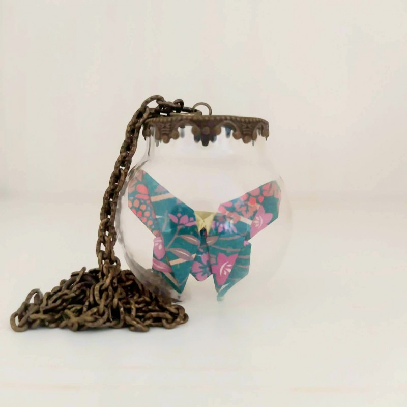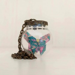 Collana con catena in bronzo e ciondolo con boccia in vetro; all'interno una miniatura di farfalla in origami simbolo di libertà e trasformazione.