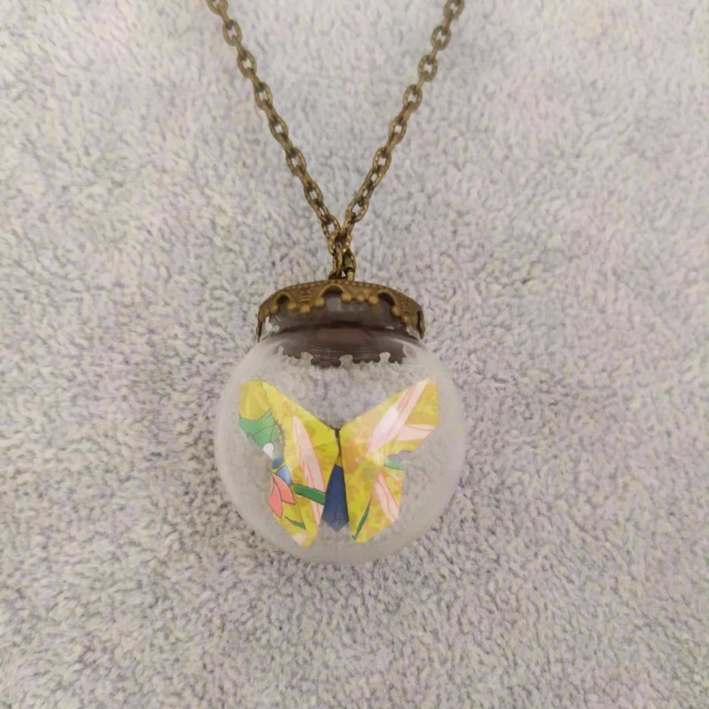 Collana con catena in bronzo e ampolla in vetro contenente una miniatura di farfalla realizzata con carta da origami con stampa Giapponese.